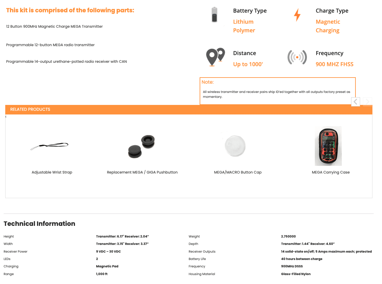 The 12-button Magnetic MEGA radio transmitter is an extremely rugged, ergonomic handheld wireless control molded out of a high-impact-rated glass-filled nylon material. Unless otherwise specified below, all MEGA series controls come with a green LED for transmit status and a red LED for battery status.
